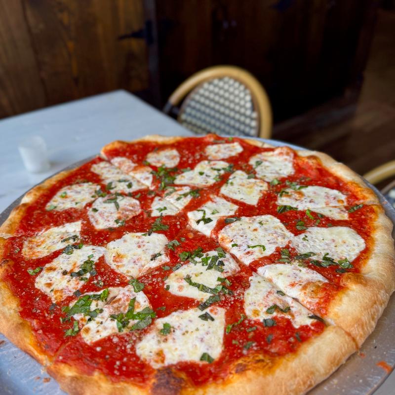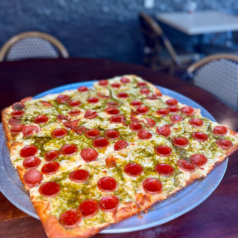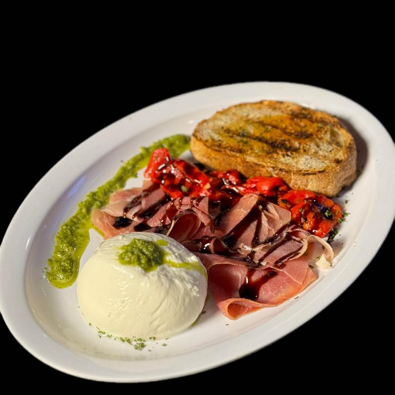 Burrata with Prosciutto and House-roasted Red Peppers. Served with Housemade Pesto Sauce, Balsamic Glaze, and our Housemade Grilled Bread.