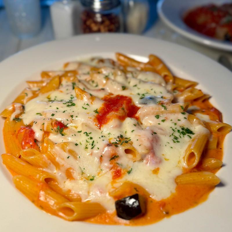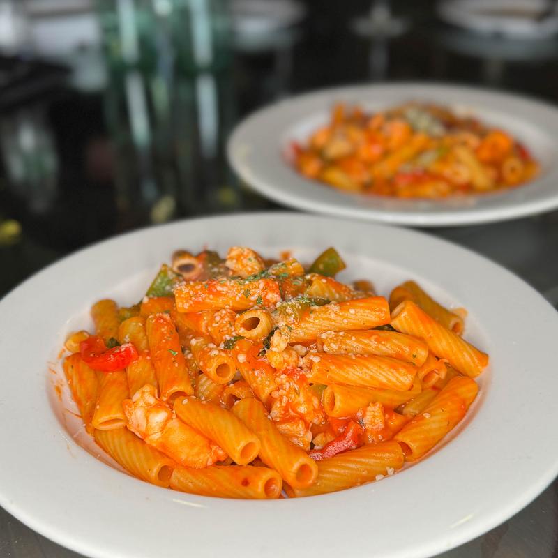 Rigatoni with a Bell Pepper and Garlic Tomato Sauce. Served with your choice of Shrimp or Chicken