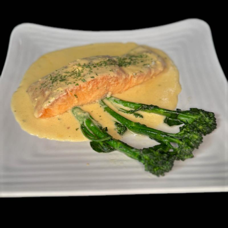 Pan Seared Salmon with a Dijon Shallot Cream Sauce. Served with Sautéed Broccolini