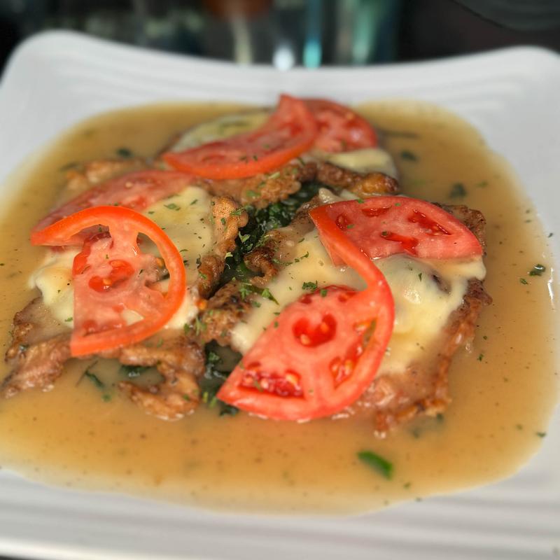 Veal Scallopini topped with Prosciutto, Provolone, and Fresh Tomato in a Rosemary Marsala Wine Sauce. Served with Steamed Spinach.